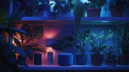 Smart speaker integrated in shelving unit with lights and plants