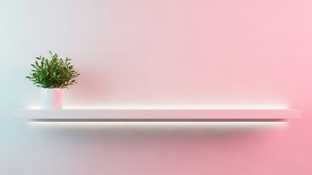 Minimalist shelf potted plant glowing light vibrant wall background