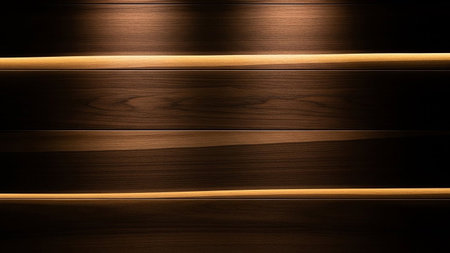 A close-up view of dark wood paneling with a prominent grain texture. Horizontal lines of warm, ambient light create a striking contrast, casting subtle shadows and highlighting the rich, deep brown tones of the wood. The lighting accentuates the natural patterns and details of the creating an and aesthetic. is backgrounds, interior concepts, or showcasing the beauty of natural wood in a modern, minimalist setting.