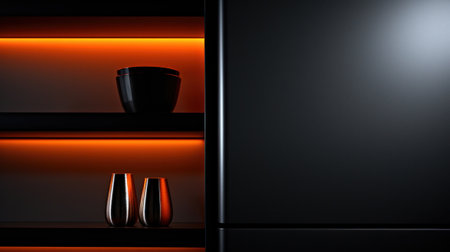A shelf with two vases on it and orange lighting, AI