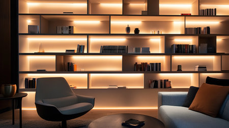 A smart AI-powered ambient lighting system embedded into modern furniture, such as shelves and coffee tables, that adjusts light intensity and hue based