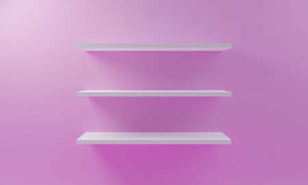 Empty white display shelves hanging on the wall, blank bookshelf or retail shelf concept, 3D render