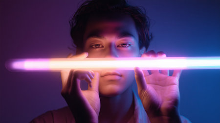 Young person holding a light stick in a dark room with colorful lighting effects