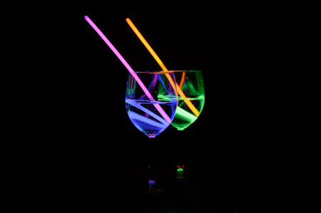 Multicolored UV fluorescent sticks in a glass at a techno party