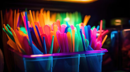 A cup filled with lots of colorful plastic straws. Generative AI image.
