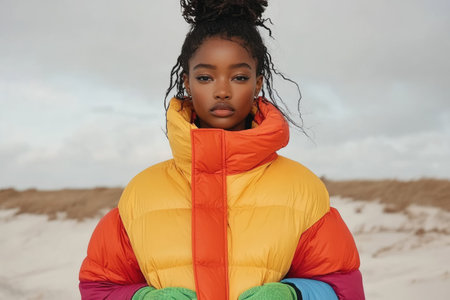 Trendy winter fashion with a colorful puffer jacket paired with warm gloves, blending style and comfort for cold weather.