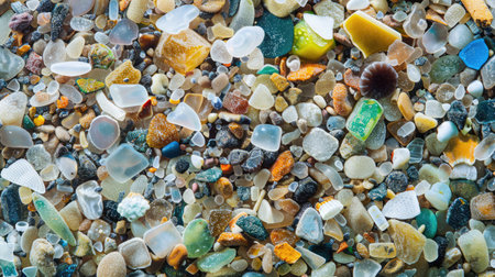 Close-up of microplastic particles background. Environmental water pollution problem of rubbish and trash in the oceans and seas