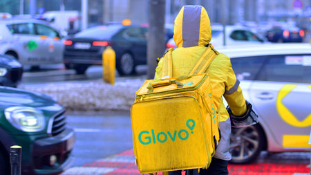 Warsaw, Poland. 15 January 2026. An unidentified Glovo bike courier seen on the street