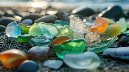 Colorful gemstones on a beach. Polish textured sea glass and stones on the seashore. Green, blue shiny glass with multi-colored sea pebbles close-up. Beach summer Ai generated