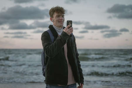a young man with curly hair smiles, takes pictures on a mobile phone, holds a smartphone in his hands, a happy young man from generation Z