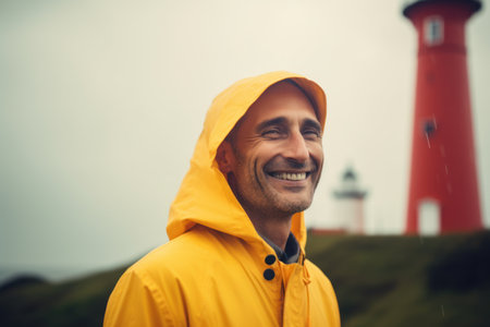 Portrait of smiling man in yellow raincoat standing in front of lighthouse