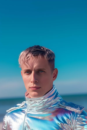 An AI generated illustration of a young man in wearing a fashionable silver jacket