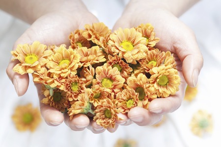 A close-up, top-down view of a person's cupped hands gently holding a vibrant orange and yellow marigold flower. The background is softly blurred, focusing on the act of giving, offering, or appreciating nature. The lighting is soft and natural.
