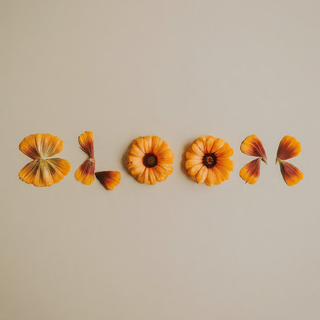 Vibrant orange marigolds complement autumn leaves in seasonal flat lay arrangement
