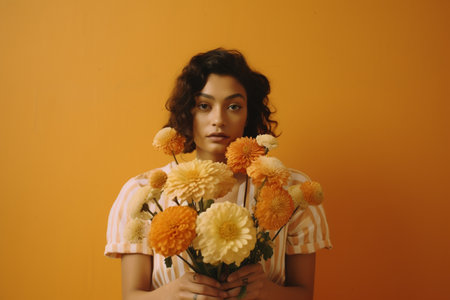 a beautiful lady with flowers standing in front of a brightly colored wall on fashion style background