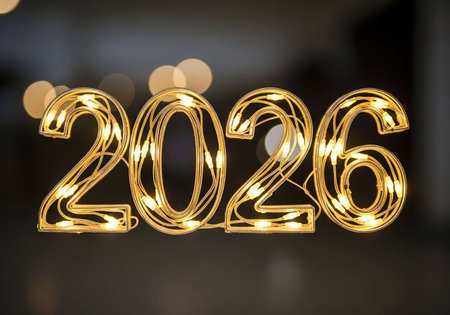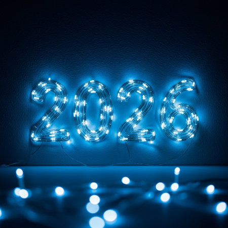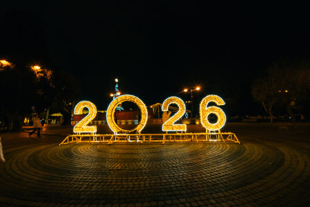 Luminous numerals representing 2026 shine brightly in dark surroundings, creating a joyful ambience ideal for countdowns or celebrations during the New Year