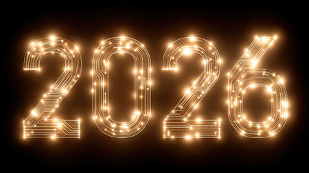 Stunning illuminated number 2026 featuring intricate circuit patterns and bright lights, perfect for showcasing futuristic themes and New Year celebrations.