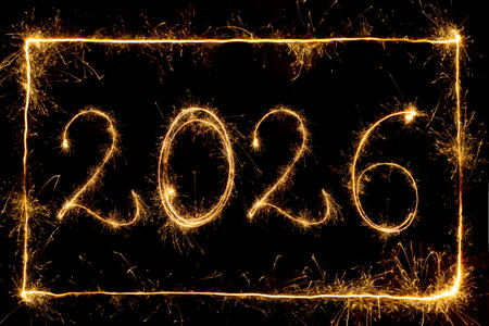 The year 2026 is written in bright, fiery sparklers against a black background.