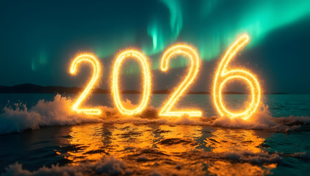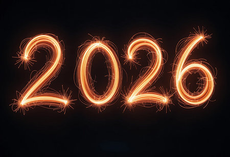Glowing “2026†written with sparkler light on a dark background, representing New Year celebration, fireworks, and festive energy. Ideal for holiday, party, and celebration concepts.
