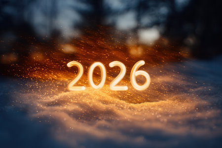 Illuminated golden 2026 numbers in the snow, glowing with sparkles and festive lights. A warm holiday atmosphere set against a winter backdrop