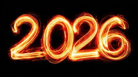 The year 2026 is artfully illuminated with glowing, fiery light trails against black.