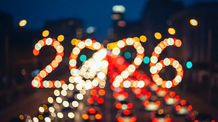 Large glowing 2026 numbers on a city street at night with blurred lights and traffic. Clear detai...