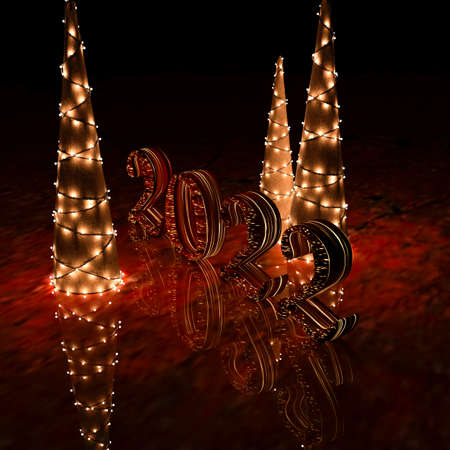 Christmas 2022 trees over indoor dark background - 3d rendering