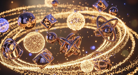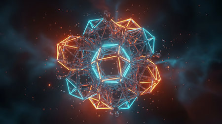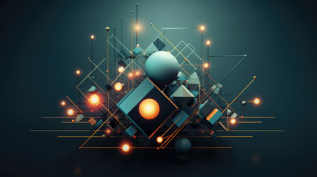 A futuristic 3D pattern of illuminated geometric shapes, floating in space with soft glowing edges, against a dark black backdrop.