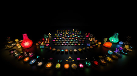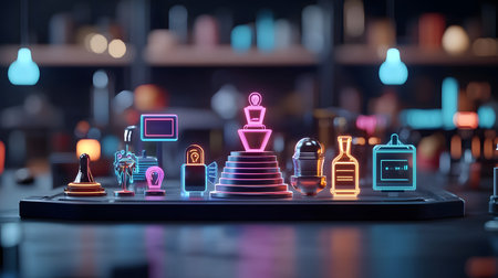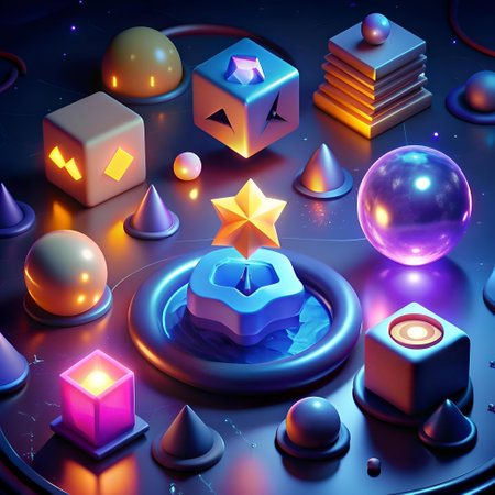 A colorful arrangement of holographic objects illuminates a futuristic setting, radiating vibrant energy. The atmosphere is whimsical, showcasing innovation and creativity throughout.