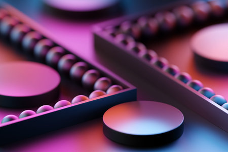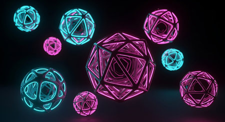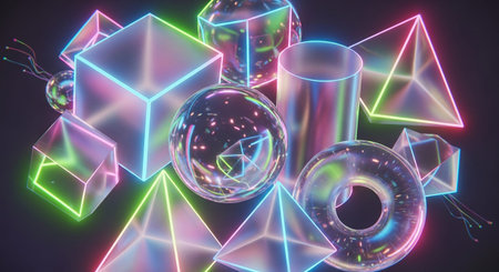 Explore a captivating arrangement of geometric shapes illuminated by vibrant neon lights. A modern and artistic composition that sparks creativity and imagination.