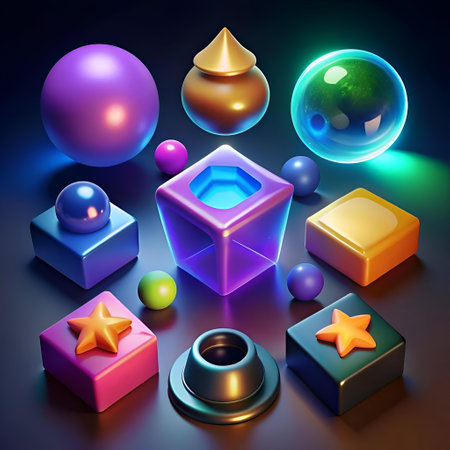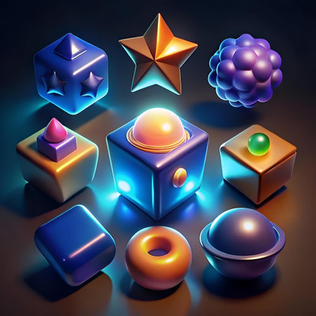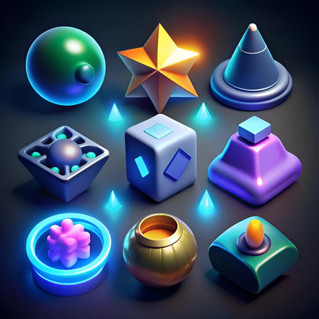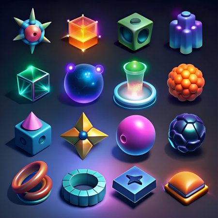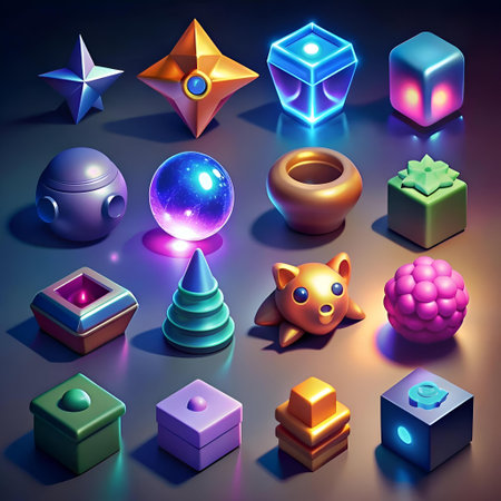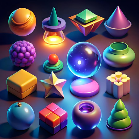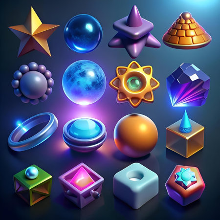 A vibrant set of 15 3D icons featuring diverse shapes and colors. Perfect for game design. mobile apps. websites. and UI/UX projects. Download now!