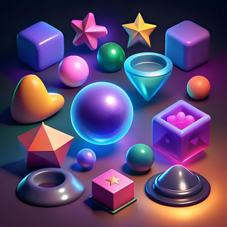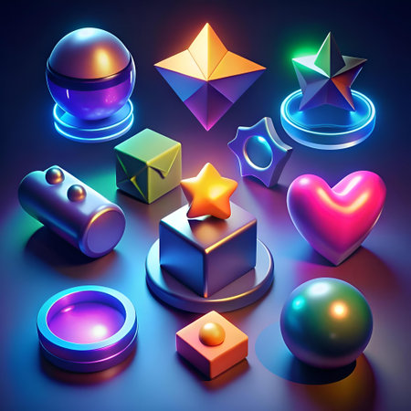 An assortment of 3D geometric shapes and solids, including cubes, spheres, and pyramids, are illuminated with neon rainbow colors against a dark background.