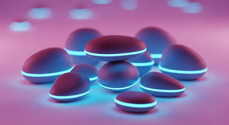 A group of smooth, dark stones of various sizes are scattered across a reflective surface. Each stone is accented with a bright neon blue light that outlines its form, creating a sense of internal energy. The background is a soft blend of pink and purple, with subtle out-of-focus glowing adding depth. This arrangement evokes a feeling of modern abstract and serene contemplation.