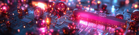 Close view of glowing computer components highlights colorful circuit details with reflective surfaces illuminated in vivid hues like pink and blue during low light conditions.