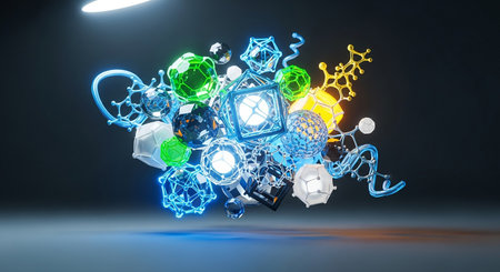 This vibrant digital artwork features an array of hexagonal icons representing scientific concepts, creating a dynamic and modern visual experience ideal for technology and innovation themes.