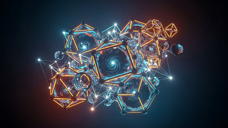 Filled showing a collection of glowing neon geometric shapes and crystalline structures in vibrant orange, blue, green, and pink float in a dark, mysterious, and...