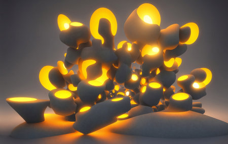 A cluster of rounded, translucent shapes in bright cyan and yellow hues are arranged in an overlapping composition. Each shape contains a swirling, smoky texture within, creating a sense of depth and movement. The are illuminated by their own internal glow, casting soft light onto a dark, reflective surface below. The background is a deep, dark void, emphasizing the luminous of the forms.