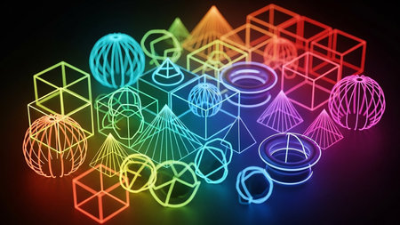 An assortment of 3D geometric shapes and solids, including cubes, spheres, and pyramids, are illuminated with neon rainbow colors against a dark background.
