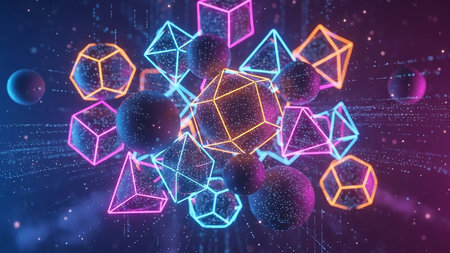 A collection of glowing neon geometric shapes and spheres, including wireframe polyhedra and solid orbs, float in a digital, particle-filled space.