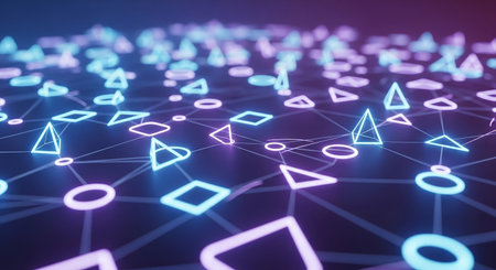 A collection of glowing neon geometric shapes including cubes, pyramids, and spheres, interconnected by wireframe lines against a dark, textured background with floating particles.