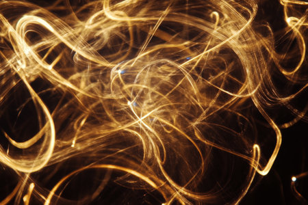 This image captures a mesmerizing display of golden light trails against a dark background. The trails form intricate, swirling patterns that create a sense of movement and dynamism. The light appears to dance and weave, producing a captivating visual effect that highlights the beauty of motion and light.