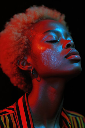 Woman with glitter under colorful reflections