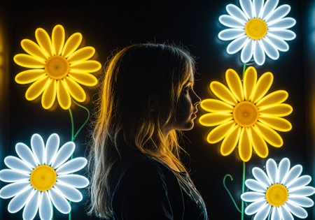 A young woman stands captivated by vibrant light trails in an urban setting at night creating an ethereal atmosphere around her.