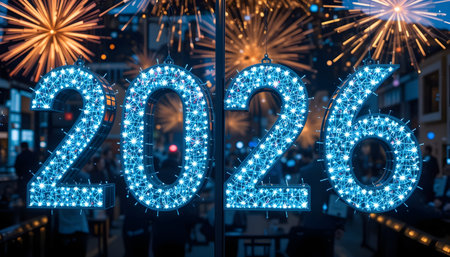 The year 2026 is creatively depicted with sparkling fireworks, surrounded by a vibrant display of lights, capturing the essence of celebration and anticipation for the New Year
