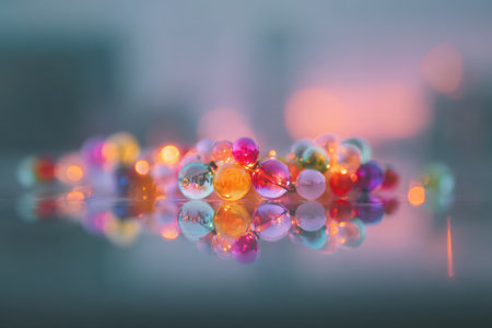 Delicate orb rests on sleek, dark surface, reflecting spectacular array of colorful bokeh lights. Blurred, radiant lights in background. Beauty of light and reflection in artistic arrangement. AI
