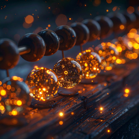 An ancient abacus is reimagined, its beads transformed into spheres of glowing digital light.