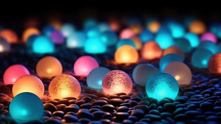 A vibrant collection of colorful spheres illuminate the dark night generated by artificial intelligence