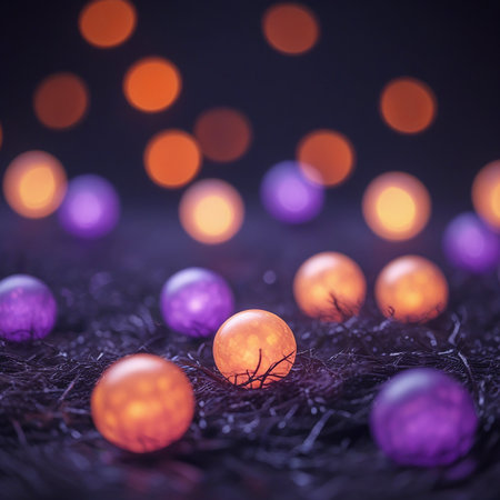 A close-up image of colorful ornaments scattered on a dark, textured surface. The ornaments are predominantly orange and purple, with some having black branches extending from them. The background features a bokeh effect with blurred lights in shades of orange and purple, creating a festive and whimsical atmosphere.
