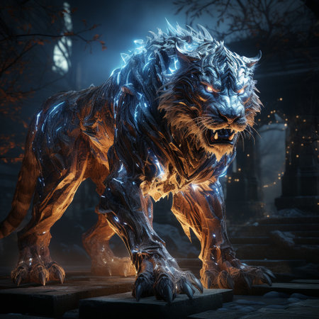 An illuminated glass tiger stands majestically, radiating a vibrant energy as a symbol of strength and grace