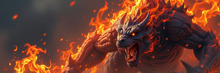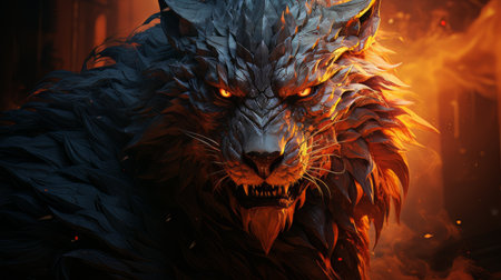 A fierce lion breathing fire, showcasing power and intensity in dramatic scene. vibrant flames contrast with lion majestic mane, creating captivating visual
